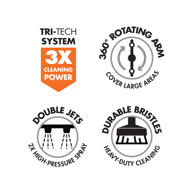 - Double high-pressure jets to blast away dirt & grime