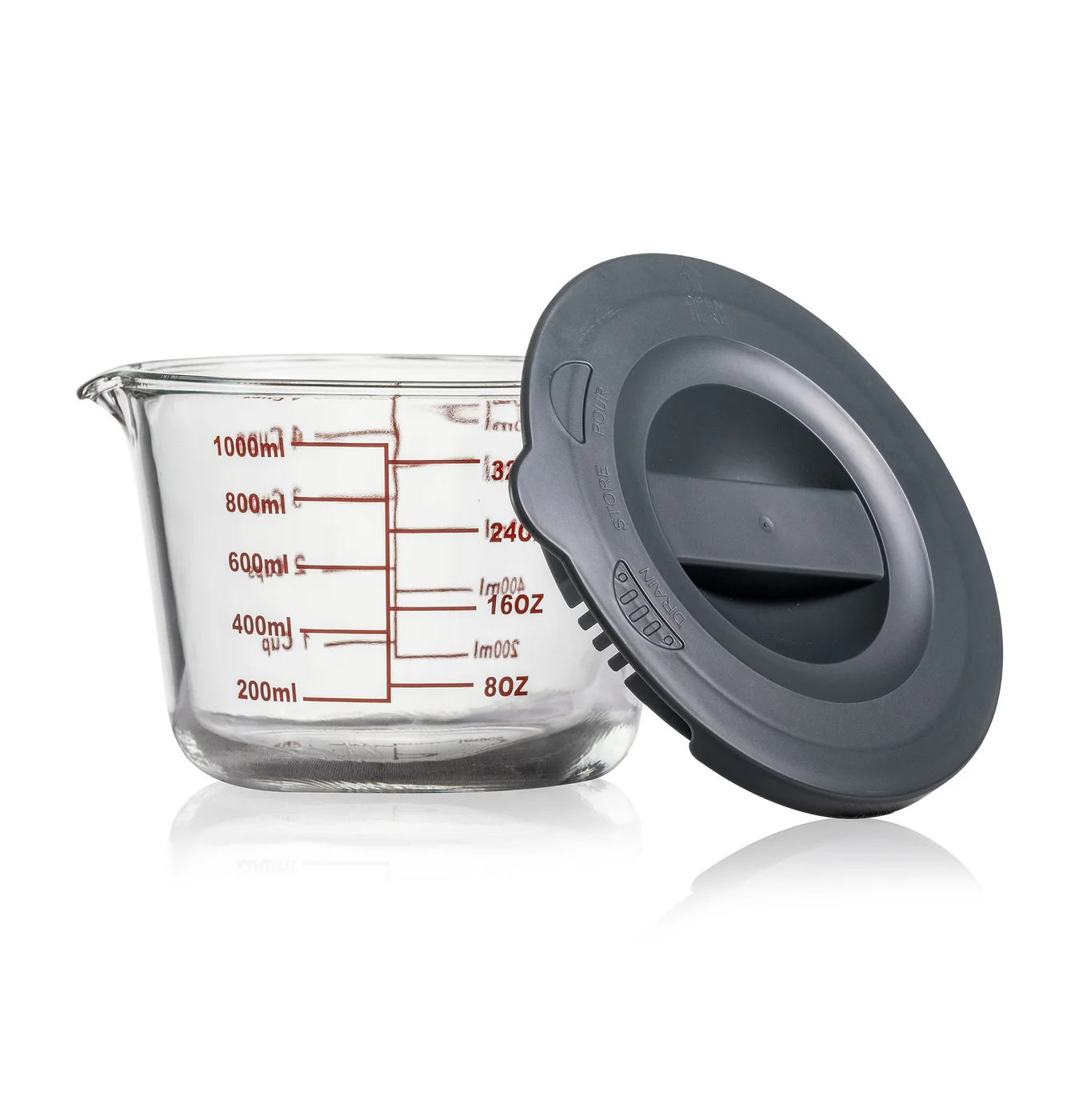 The Palma 1000ml glass measuring jug with grey lid and bright red lines and text is a must-have in every kitchen. Making the measurement of any ingredient quick and easy.