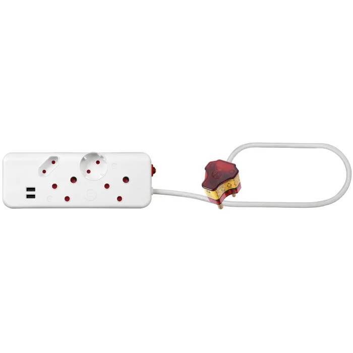 The Ellies FBWP4U surge protector powers up to 4 appliances with 2 USB ports (1.1A and 2.4A) and offers quick reaction surge protection with a max combined current of 18,000–24,000 Amps. It features a 0.4m cord, built-in home wiring tester, overload protection, safety shutters, and an indicator light ensuring safe and reliable use. Manufactured with fire-resistant materials, it supports a max load of 3680W and comes with a R30,000 warranty, meeting high South African safety standard