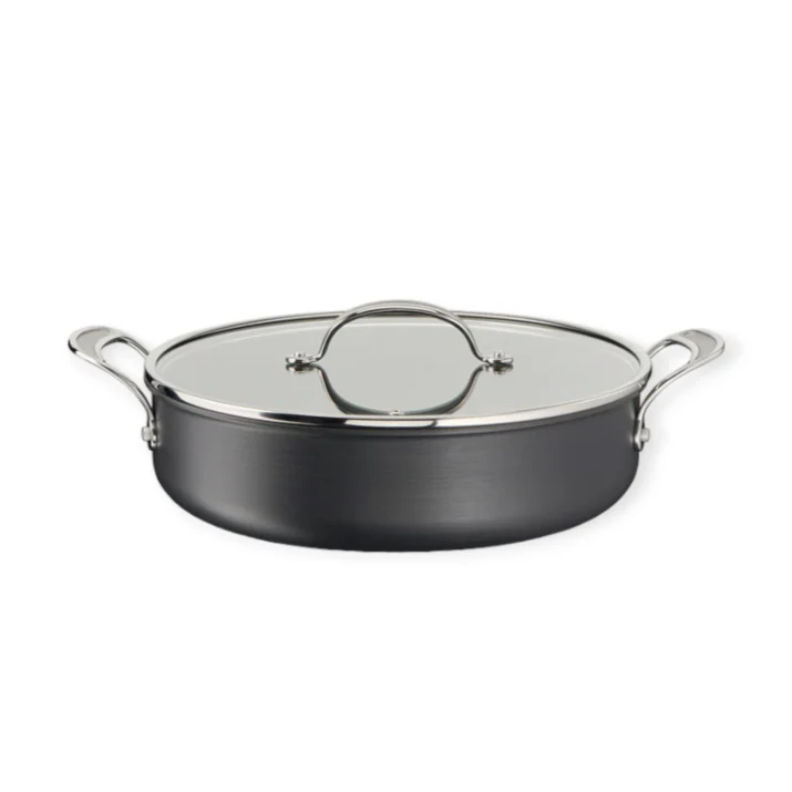 The Jamie Oliver Cooks Classics 30cm Hard Anodised ShallowPan has a Thermo-Signal heat indicator, and it is designed with a superior non-stick inner coating.