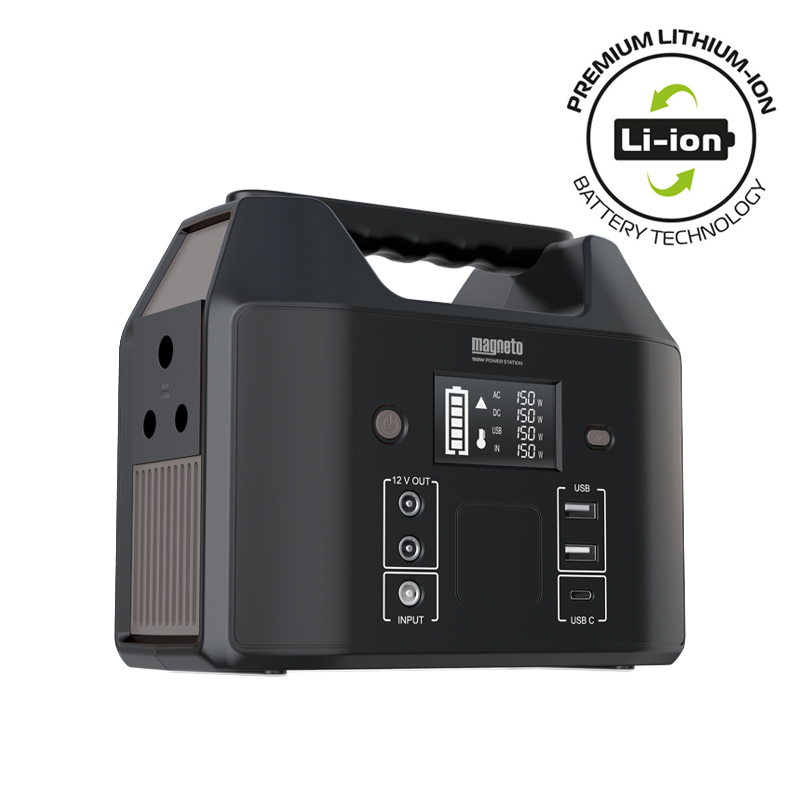 The Magneto® 150W Portable Power Station provides backup power for your home. This mini mobile power station is a versatile and reliable solution to power outages. It is an easy-to-use battery pack for the house that has been designed with a premium Lithium-ion battery and rugged ToughGuy casing. This compact power station is equipped for fast recharging and on-the-go power. It gives you convenient recharging options, allowing you to recharge it via an AC wall outlet, 12V DC car port, or 40W solar panels (not included). You can power up many essential household devices simultaneously, and it comes with a 3-prong outlet for ease of use. What devices are compatible? It can charge any device that uses less than 150 Watts of power. *To give you an estimation of its run and charge times: a 7-Watt light bulb can run for 19 hours, a 100-Watt TV can run for 1+ hours, a 30-Watt fan can draw 4+ hours of power from it, a 10-Watt WiFi router will keep your internet running for 13+ hours, and a 150-Watt fridge will keep your food cool for 1 hour. In addition to this, smartphones and laptops can easily be charged: A 3400mAh smartphone will be able to draw 10+ recharges, and a 7500mAh laptop will draw 4+ recharges. *Please check the operating power of your device/s before use. Considering this portable power station price, it is an affordable option to run all your household basics.