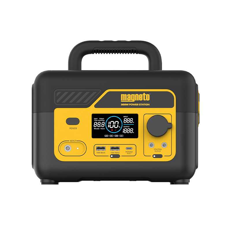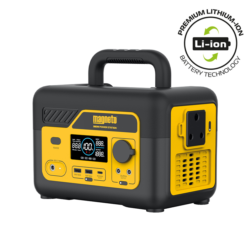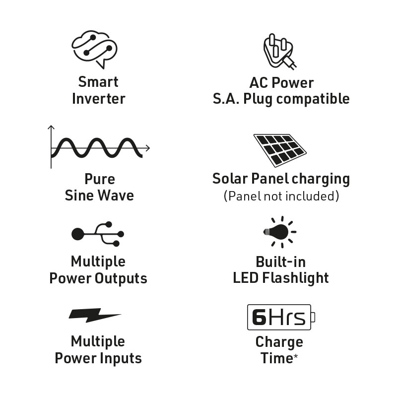 The Magneto® 300W Portable Power Station ensures you can continue with your daily activities no matter what your electricity-supply situation is. It is the perfect loadshedding backup power solution for homes, offices, and the outdoors! With a high-quality Lithium-ion battery, rugged ToughGuy casing, a 3-prong outlet, a built-in LED flashlight, and multiple output ports, this backup battery for home is conveniently equipped for fast recharging, enhanced visibility, and reliable on-the-go power. Power up all your must-have household devices by simply charging your power station via an AC wall outlet, 100-Watt USB-C port, 60 to 120-Watt solar panels (not included), or even on-the-go in your car, with the 12-Volt car port. ‘What devices are compatible?’, you ask. The 300W Portable Power Station can charge or run any device that uses less than 300 Watts of power. To give you an idea of what you can expect, our estimated run times are: over 49 hours for a 7-Watt light bulb, over 3 hours for a 100-Watt television, 11+ hours for a 30-Watt fan, 34+ hours for a 10-Watt WiFi router, and just over 2 hours for a 150-Watt fridge. What’s more, recharging phones and laptops is a breeze. A 3400mAh smartphone can get up to 27+ recharges and 7500mAh laptops can get 12+ recharges. *Please check the operating power of your device or devices before using your Magneto power